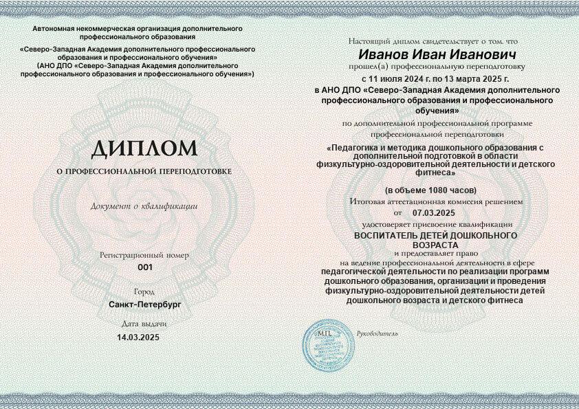 Каждый документ (диплом/удостоверение/свидетельство) соответствует п.2 ст.60 N-273 ФЗ, оформляется на русском языке, печатается на типографском бланке, защищённом от подделок. Ставится официальная печать образовательной организации. С образцами документов можно ознакомиться на сайте в разделе «Лицензия и документы».