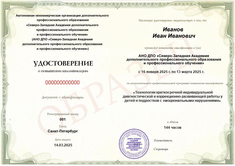 Курс повышения квалификации Технологии краткосрочной индивидуальной диагностической и коррекционно-развивающей работы у детей и подростков с эмоциональными нарушениями (144ч)