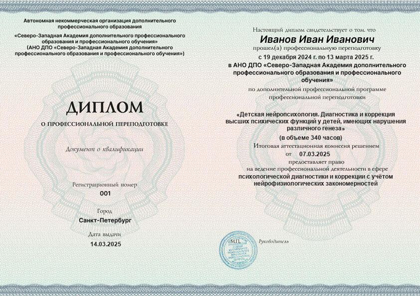 Курс обучения Детская нейропсихология. Диагностика и коррекция высших психических функций у детей, имеющих нарушения различного генеза (340ч)