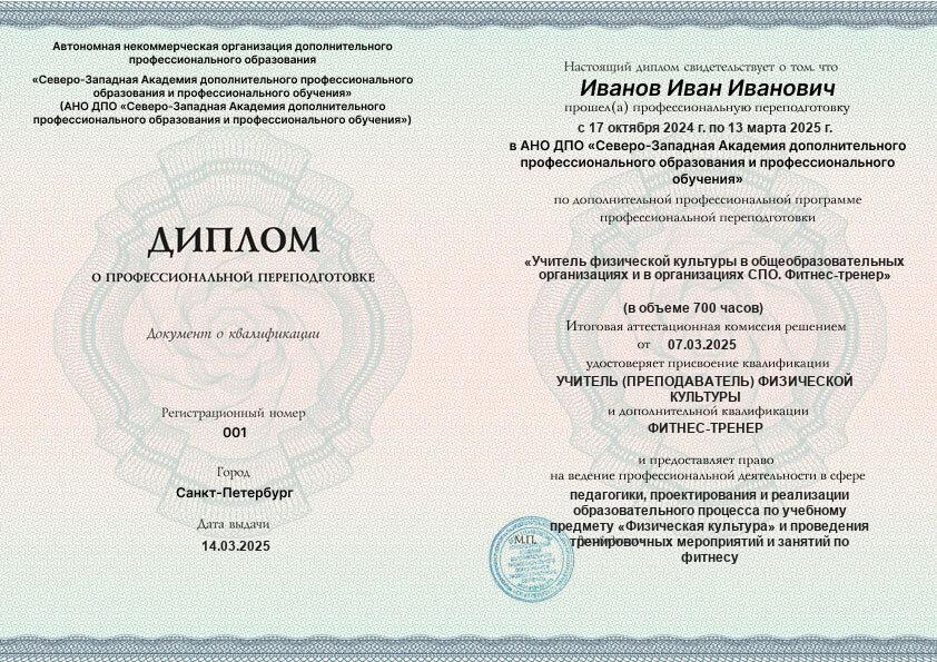 - 2 квалификации: Учитель (преподаватель) физической культуры + Фитнес-тренер
